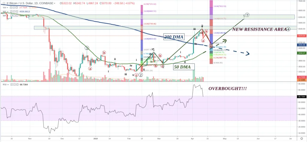 I have had to modify a little bit my EW-count with the last BITCOIN movements which is currently correcting strongly after having reached another new High of the year.A totally expected movement after the explosive rise of the last days to be honest.The following chart was the former one on which I was working on: