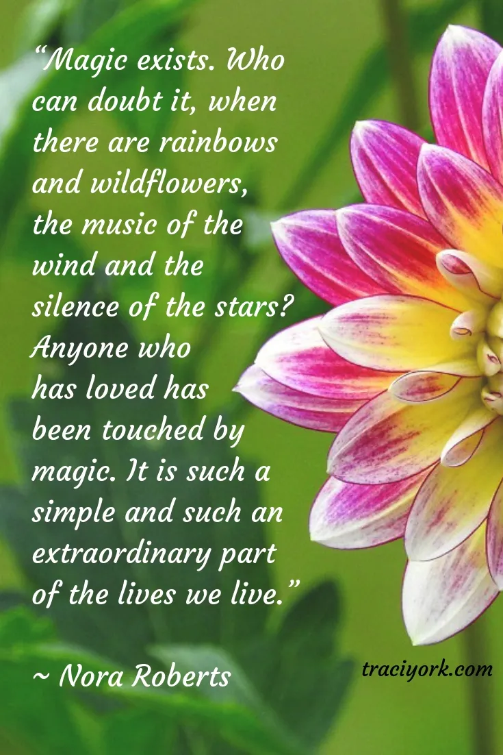 Just to make sure you don't see the picture of the front of the cards before you've made your choice, I'm putting a graphic here as a type of spacer/spoiler prevention. I made this particular quoto using a Dahlia picture I took, and the words of Nora Roberts (from her book, Charmed & Enchanted).