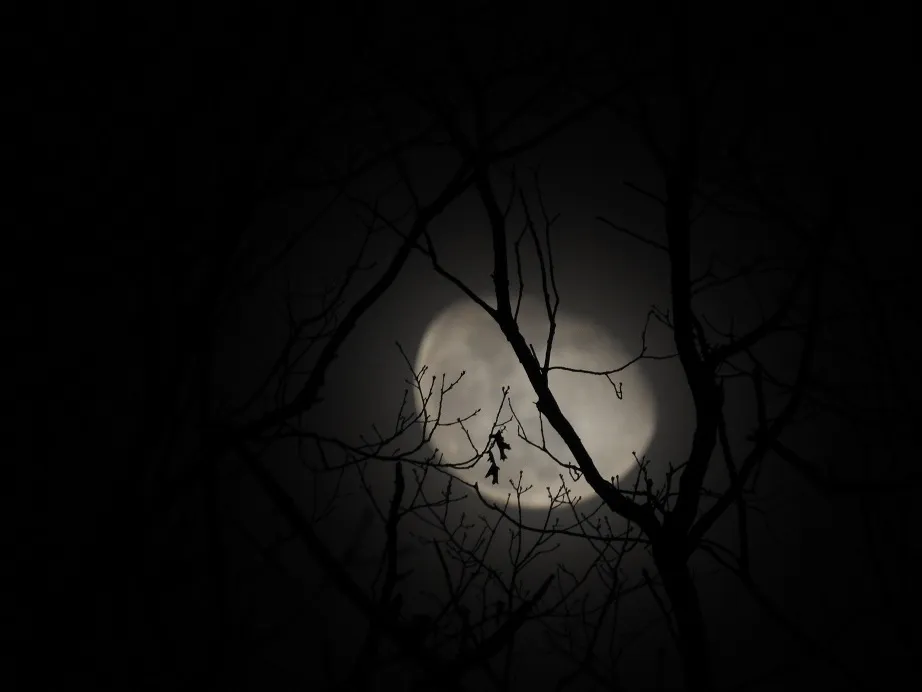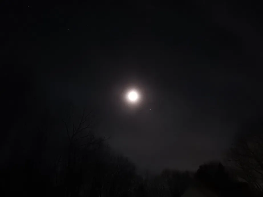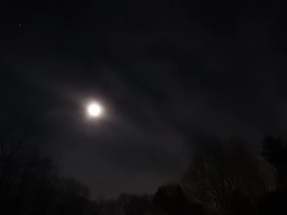 Thanks to my brain working properly today (for the most part), I also remember our youngest told me how gorgeous the moon looked as it was rising behind the trees, and as it was a warm-ish kind of evening (somewhere around 43F/6C, according to AccuWeather), I hustled outside with my camera and tripod.