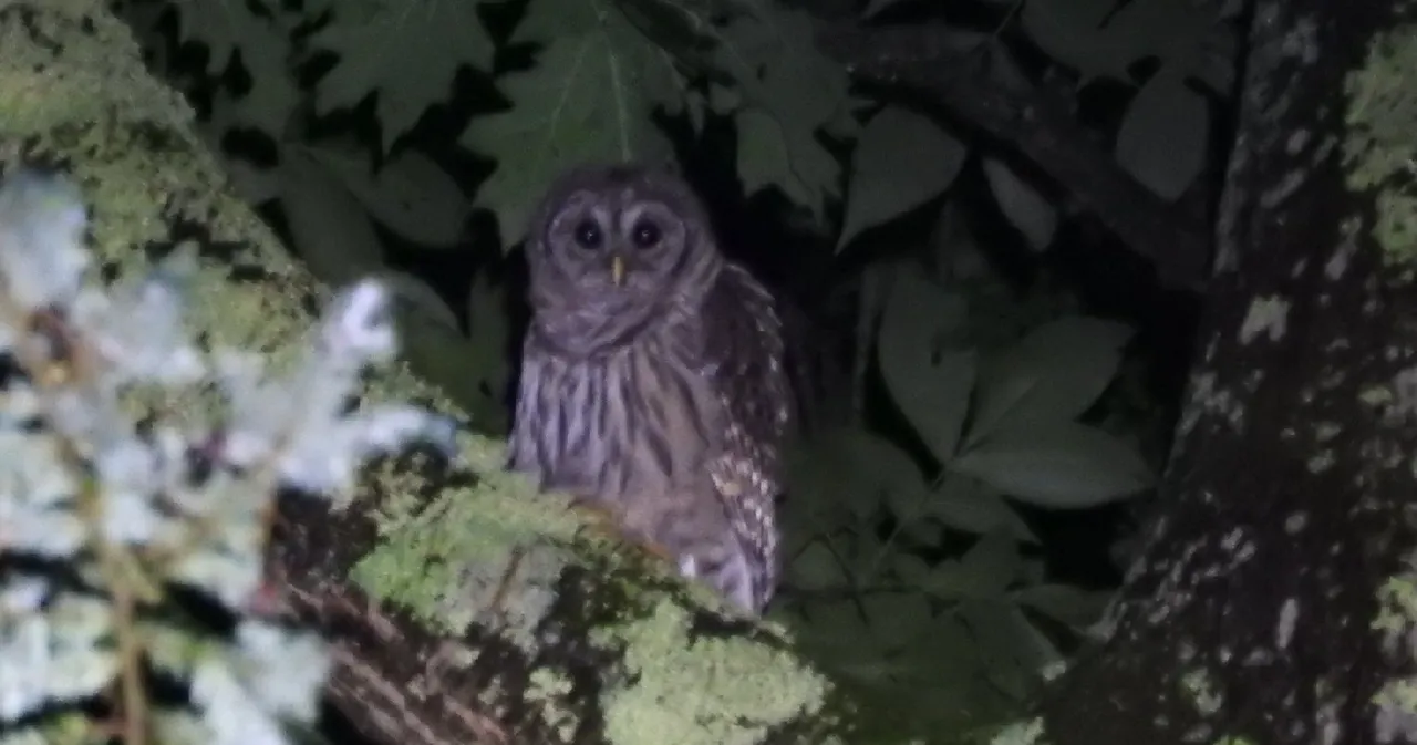 Bonus picture - not the best quality, but I think this is the very first shot I got of an owl baby! It was early evening that same day - Hubby & I had heard a strange screeching noise outside, and long story short, I managed to get this shot of the curious little guy!