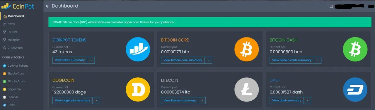 This is the main wallet to hold your faucet claims for Bitcoin, Bitcoin Cash, Litecoin, Dash and Doge. You also earn Coinpot tokens for each claim you make. Any of the coins can be transferred free of charge for any other coin. Take for example my wallet. I claim all of the faucets but only want BTC, so I convert all my claims to Bitcoin!