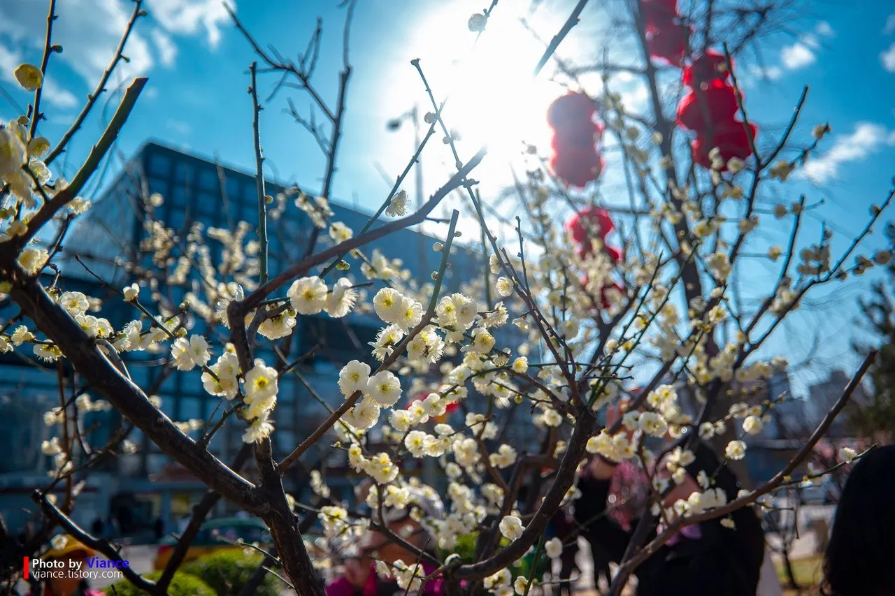 하얀 매화와 중국 특유의 붉은 등이 겹쳐 아름다운 풍경을 그립니다.