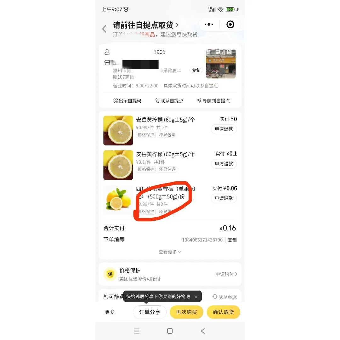 前两天姐姐又说要喝柠檬水,所以队友前天跟我说在某团上面买了四个柠檬,让我昨天早上记得去附近的自提点取货。我自然是不敢忘了这回事,等我在自提点的某团专配的菜篮子翻找了一圈之后,柠檬我是找到了,可是只有四个柠檬的我真没有找到啊!只有一大袋子,随便目测一下已经超过十个的柠檬群。我傻傻的愣在那里,拿也不是,不拿也不是,生怕拿错了别人的,那多不好意思啊!