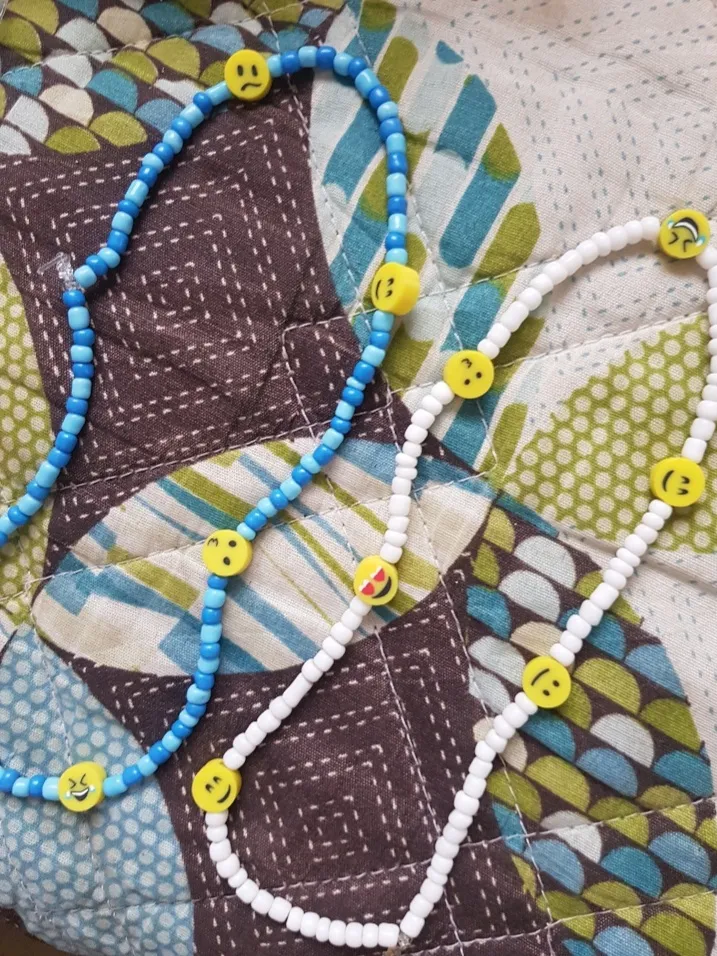 Comenze por los pulsos tejidos los cuales tienen distintas formas y colores son fabricadas mediante hilos llamados Cola de Rata ,estos son hilos gruesos de distintos colores los cuales te permiten hacer un tejido perfecto a la hora de usar en la mano o pie ,que permite estirarse y recogerse a la forma que la persona lo desee.Luego con el paso del tiempo agrege mostacillas, perlas y diges que le daban a estos accesorios un toque más llamativo tanto por el tamaño y los colores.Ya no solo eran pulsos si no gindalejas para bolsos,celulares,o otras prendas ,y algunos tipos de collares,en muchos casos confeccionaba juego de pulso con el collar del mismo color y forma.