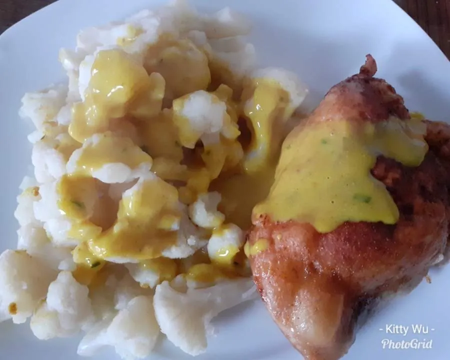 Cauliflower (frozen) on sale, chicken (on sale) with curry sauce (out of the cupboard, it's made from powder and water).