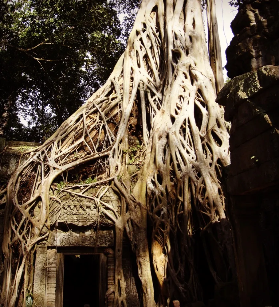 Raíces creciendo encima de las entradas a los templos, rodeando las esculturas, en definitiva, formando parte viva de cada uno de los templos de este lugar.