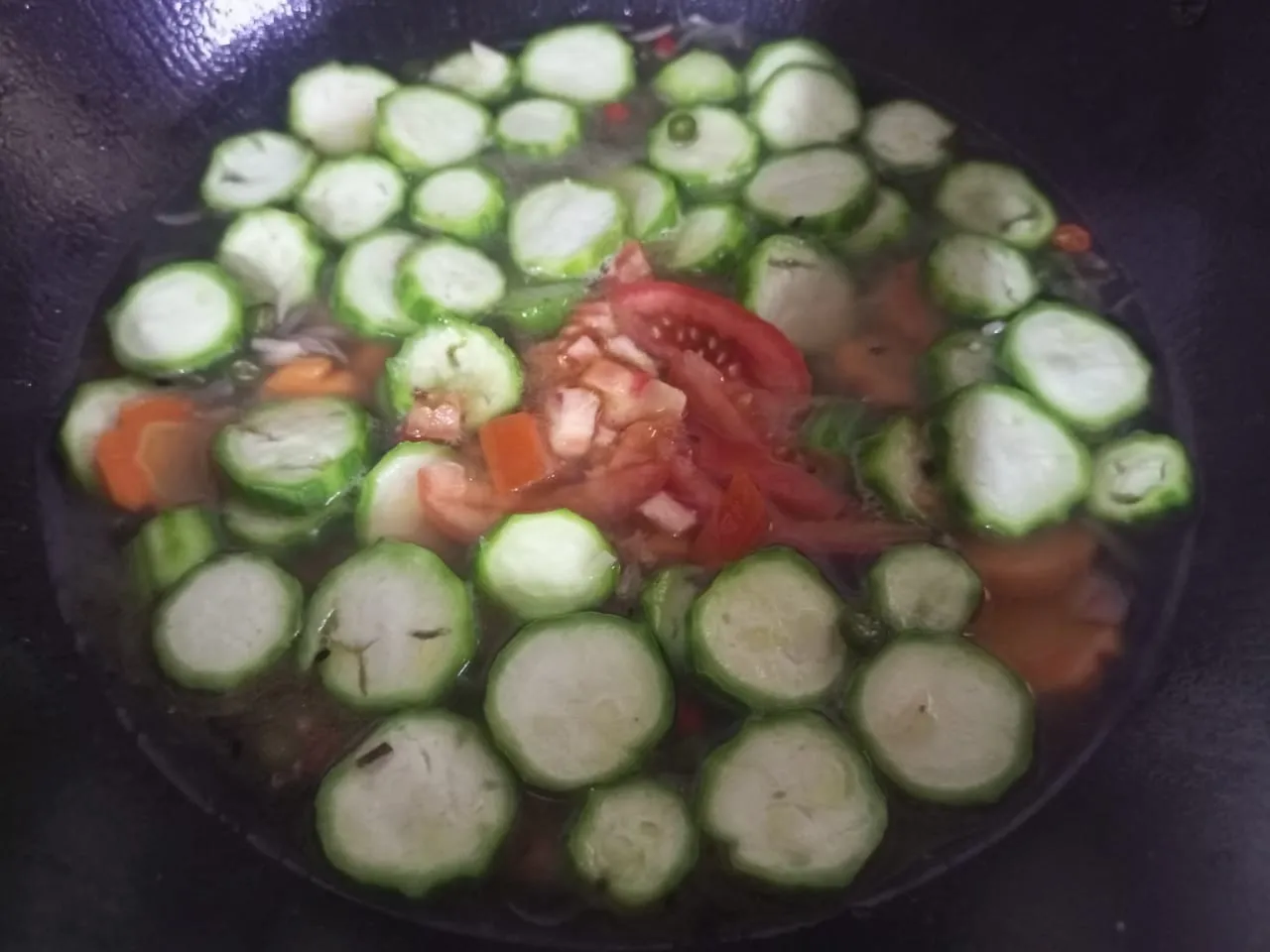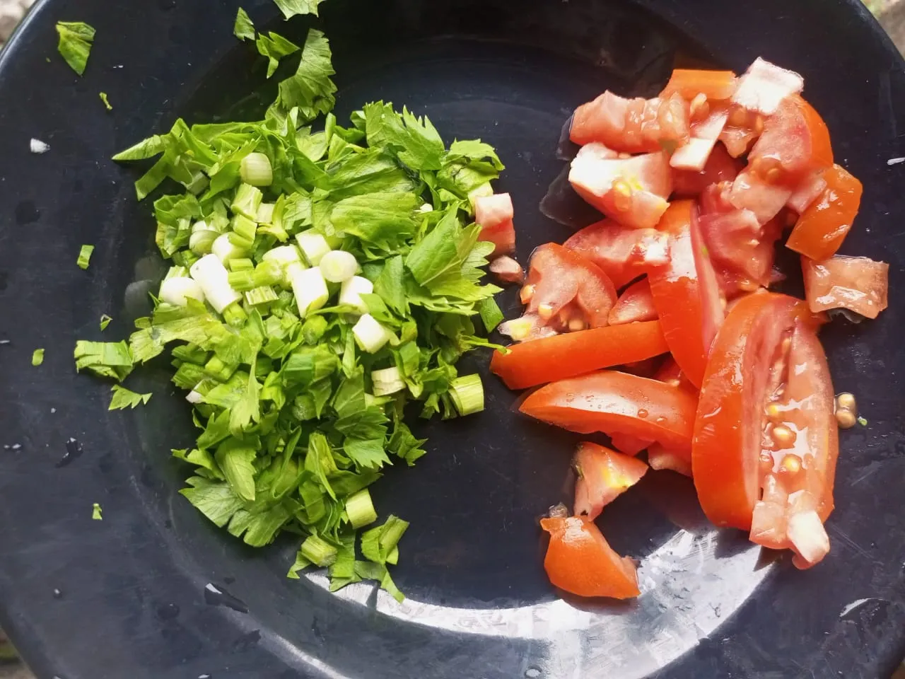 🔸 Add the chopped tomatoes along with the soup leaves.