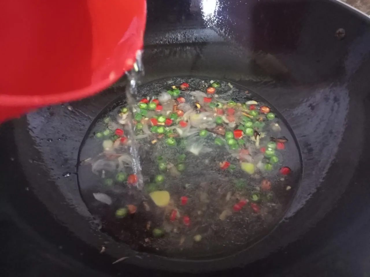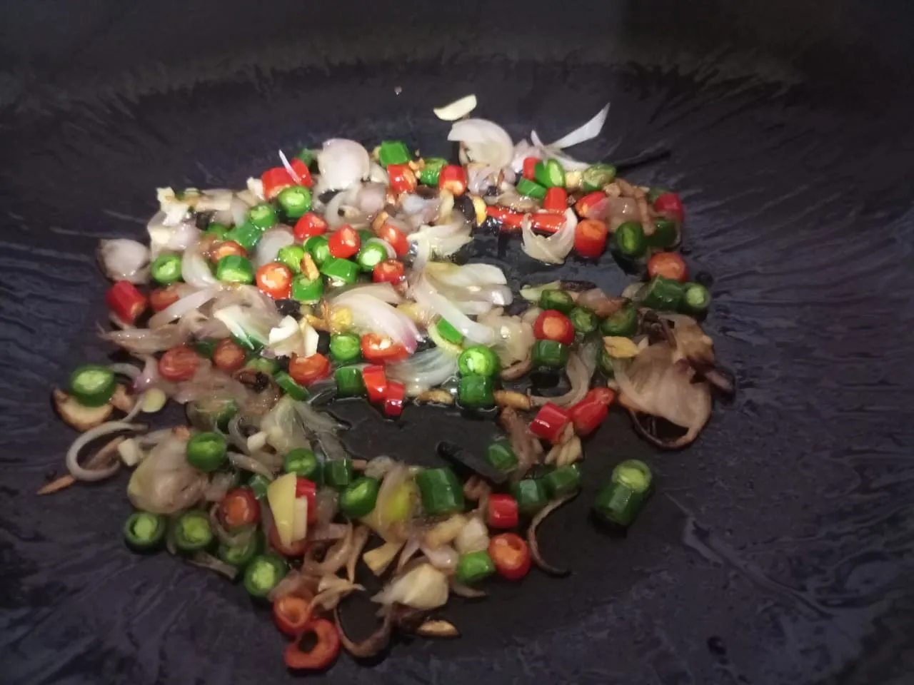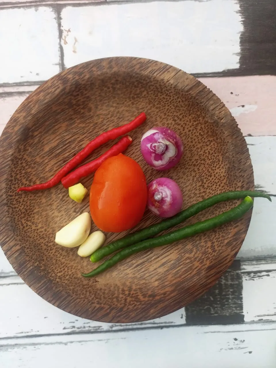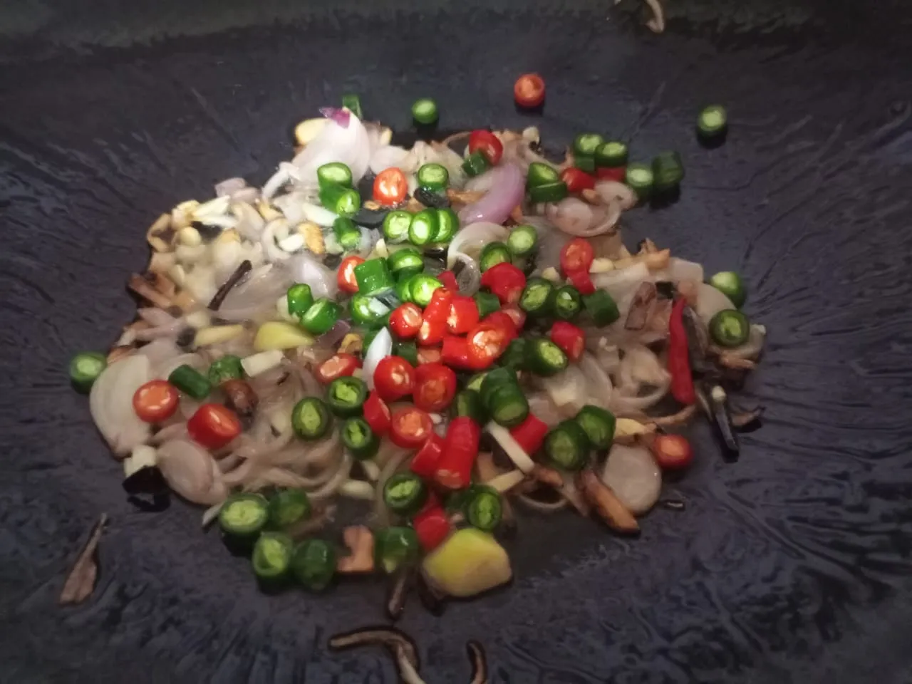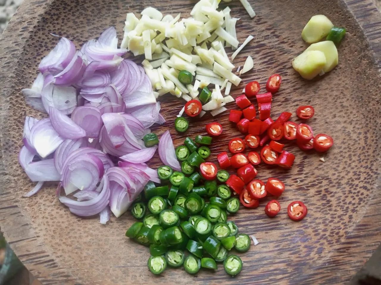 🔸Slice shallots, garlic, red chilies, green chilies and ginger.