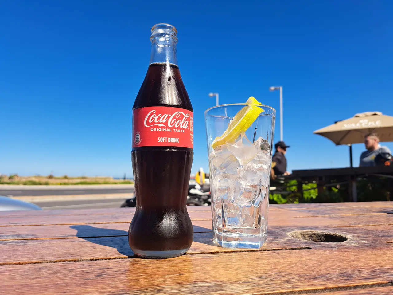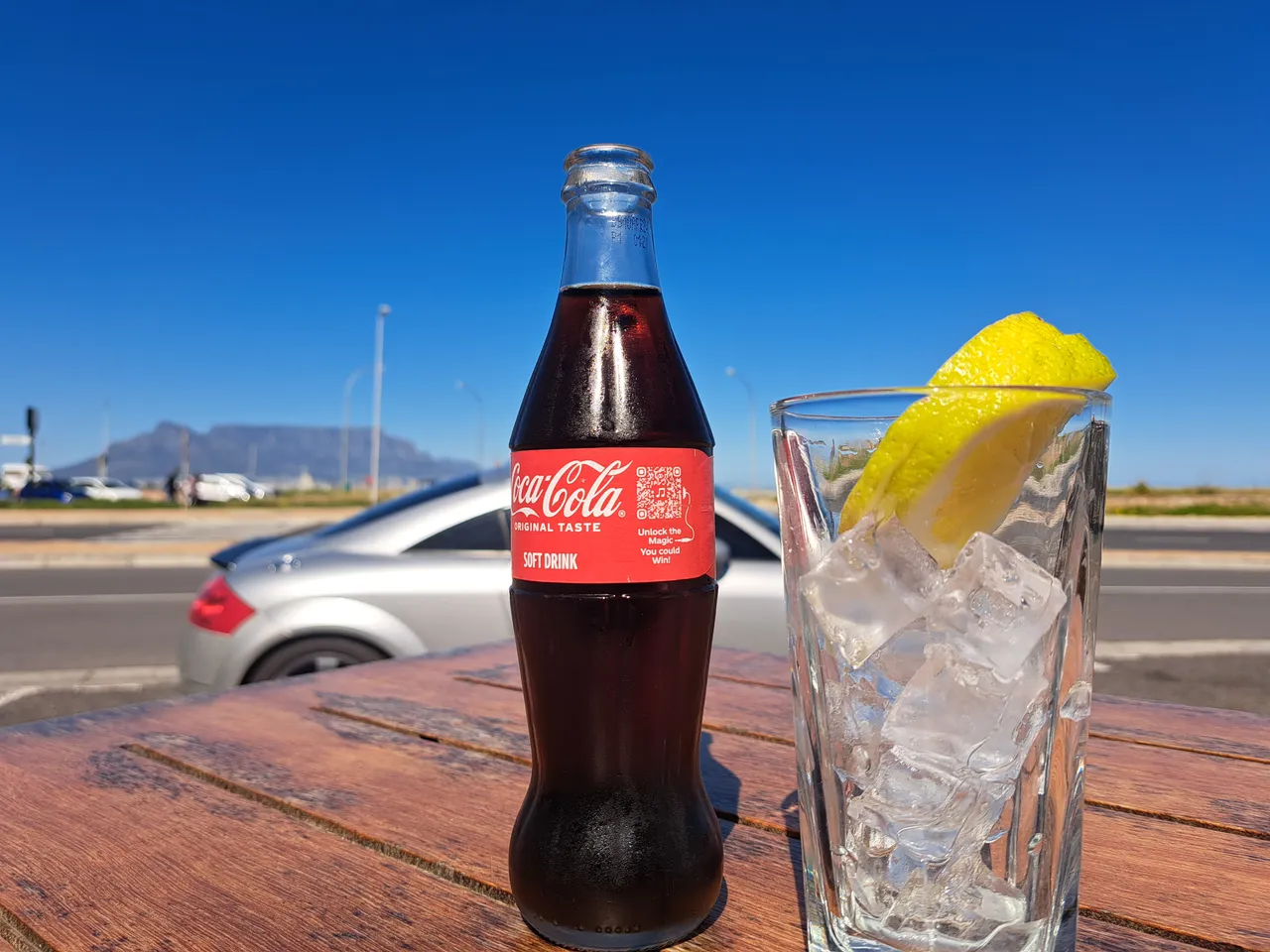 Our drinks were the first to arrive. Check out the awesome perspective shots I took. That blue sky and the mountain beyond!