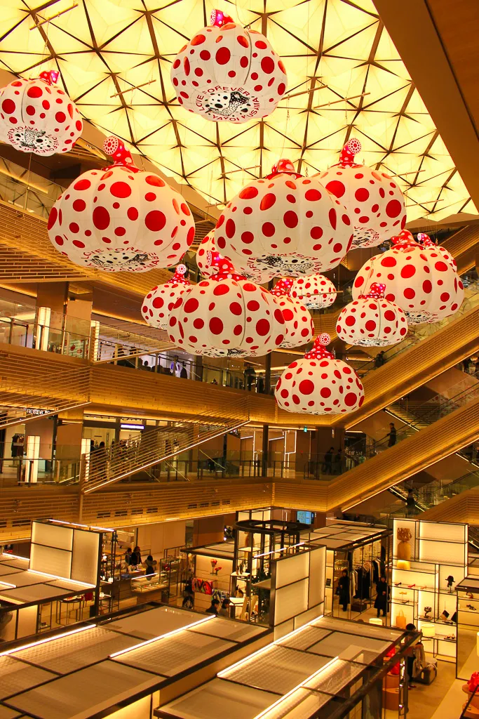 쇼핑몰 내부의 천장에는 이렇게 땡땡이 그리고 호박로 예술을 하는 쿠사마 야요이라는 일본의 작가의 작품이 전시되어 있었습니다. 천장만 보고도 이곳에서 어떤 제품들을 팔지 궁금해지더라구요.