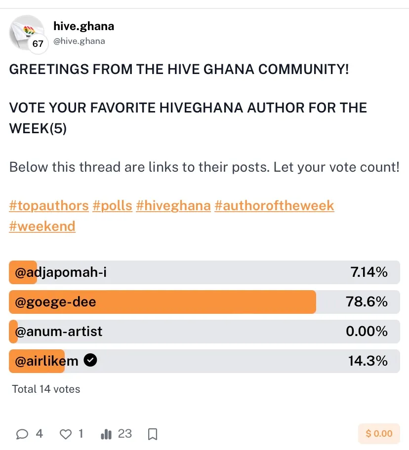 Congratulations to @george-dee for winning last weeks edition of the HiveGhana Author the week intiative. As his reward for working hard and engaging with others in the HiveGhana community and also winning the polls, he is a beneficiary to 60% of this post’s reward.