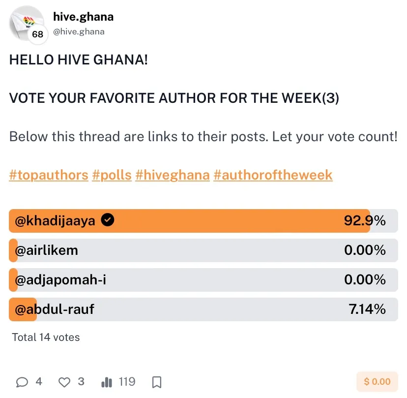 Congratulations to @khadijaaya for winning last weeks edition of the HiveGhana Author the week intiative. As her reward for working hard and engaging with others in the HiveGhana community and also winning the polls, she is a beneficiary to 60% of this post’s reward.