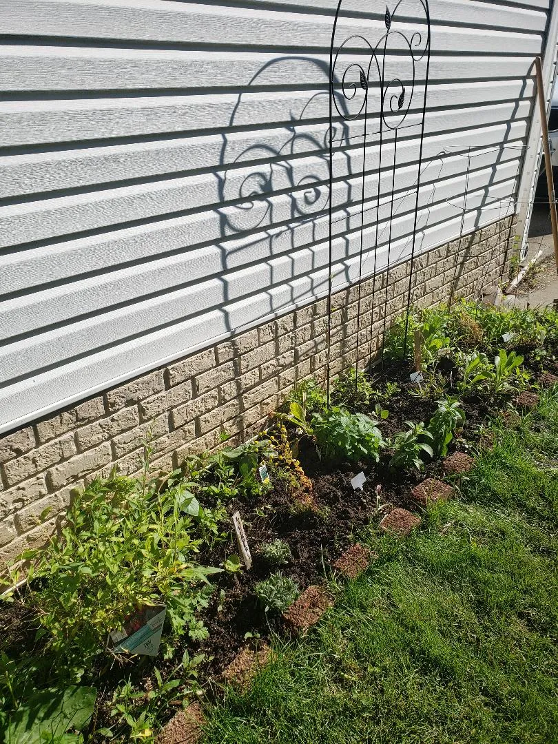 I planted the two marsh mallow plants in the back near the new trellis I got from a garage sale. I have both of them tied gently to the outer trellis