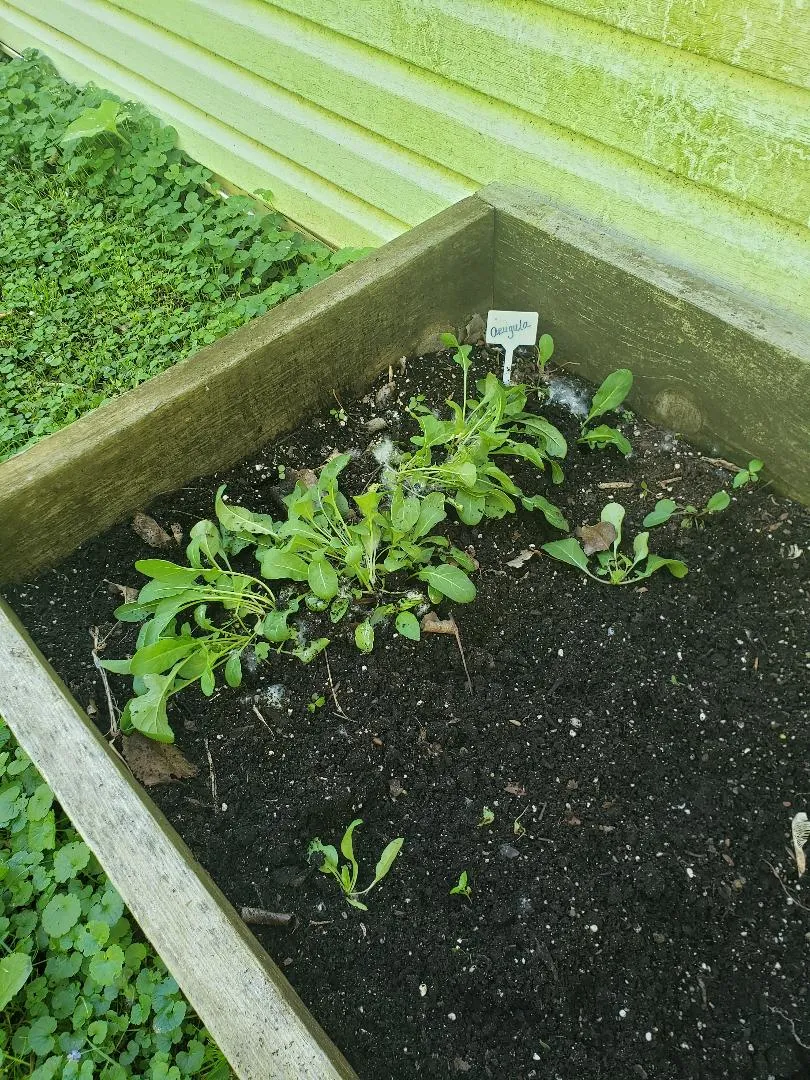 My arugula is coming along nicely. The one row I'll be harvesting soon and the second and third rows I planted two weeks after are just starting to peek up.
