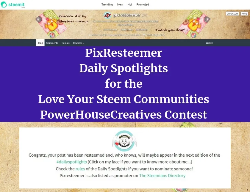 Posted from my blog with SteemPress : https://www.traciyork.com/pixresteemer-daily-spotlights-for-the-love-your-steem-communities-powerhousecreatives-contest/