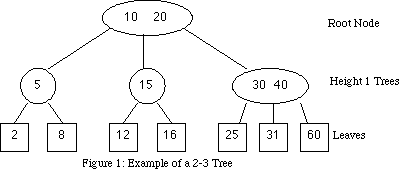 A 2-3 Tree is a Tree where each Node has 2 children and one data element (2-Node) or 3 children and two data elements (3-Node). So, we now don't have left and right only, but also a center child sometimes. This Trees are also balanced cause the left, center and right subtree contain close to the same amount of data.