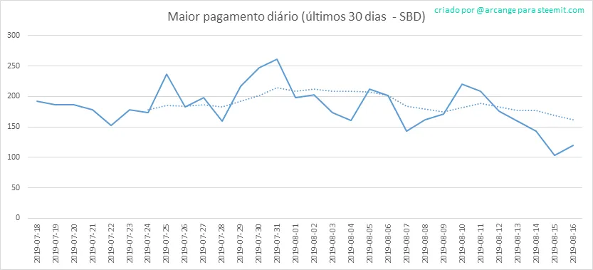 Este gráfico mostra o máximo de recompensa pago por um post (ou comentário), em cada dia (durante todo funcionamento da blockchain e os últimos 30 dias)