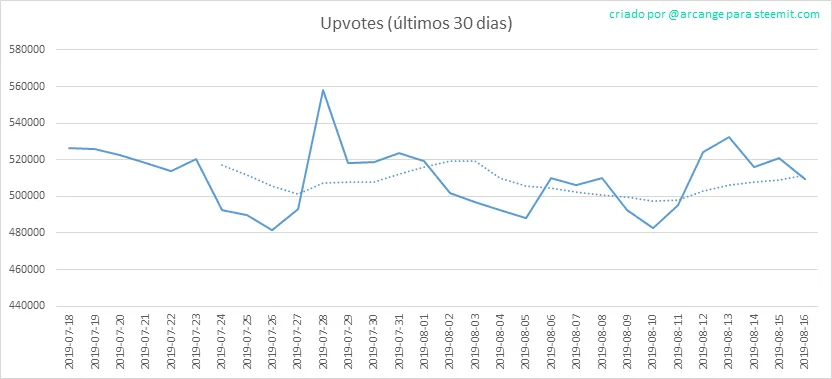 Esses gráficos mostram a evolução da curadores (upvotes) desde o início do funcionamento da blockchain e dos últimos 30 dias.