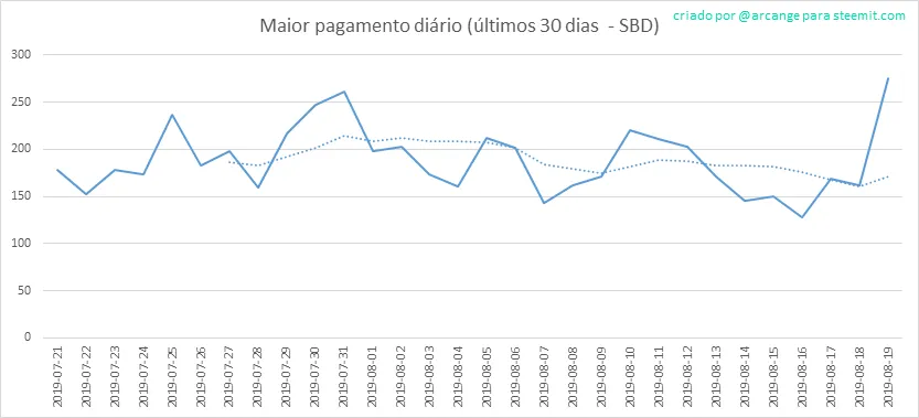 Este gráfico mostra o máximo de recompensa pago por um post (ou comentário), em cada dia (durante todo funcionamento da blockchain e os últimos 30 dias)