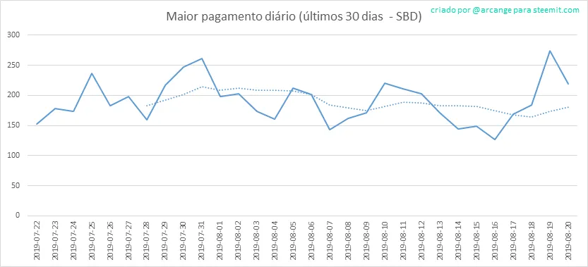 Este gráfico mostra o máximo de recompensa pago por um post (ou comentário), em cada dia (durante todo funcionamento da blockchain e os últimos 30 dias)