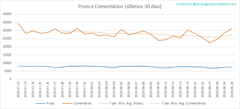 Esses gráficos mostram a evolução dos posts e comentários desde o início da blockchain e dos últimos 30 dias.