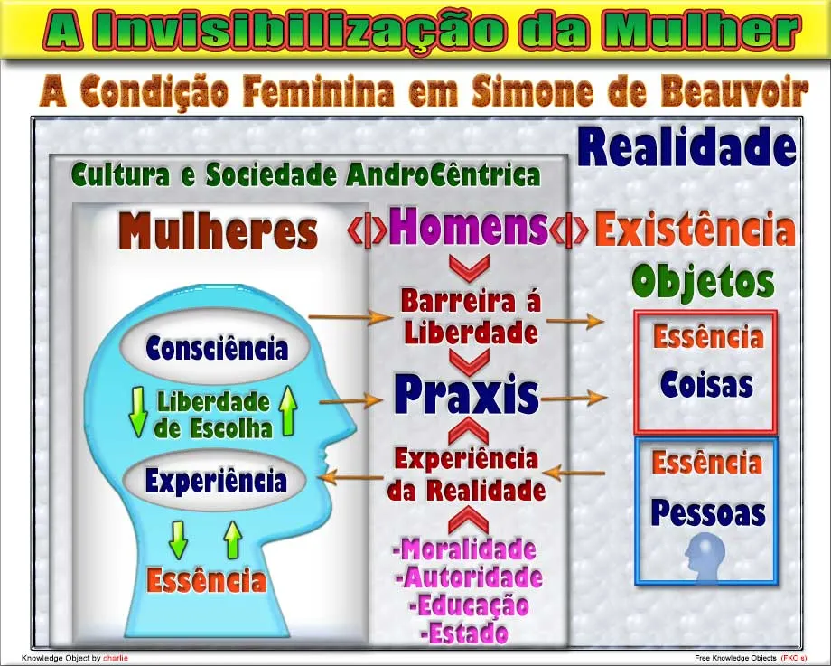 A estatuto de ser Mulher é condicionado pelos Homens que se interpõem entre o género feminino e a relação da sua consciência com a realidade, preenchida por uma sociedade e um cultura androcêntrica, que é sempre favorecida pelo poder de Estado machista, desvalorizando todas as as ideias e a praxis social feminina, condicionando a sua liberdade de escolha.