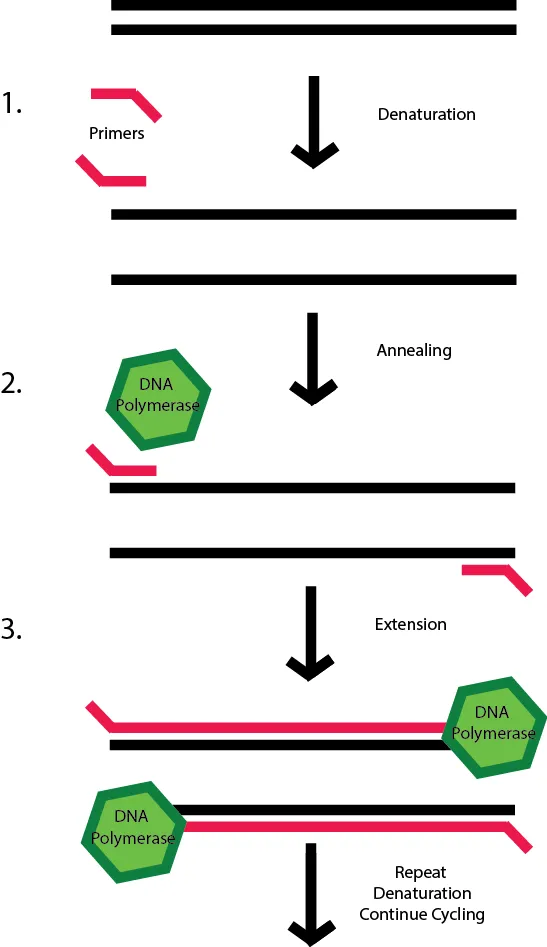 After the extension step the reaction is re-heated to the denaturation temperature to split the strands, and the process is repeated usually for 25-30 cycles (A cycle is each step in order: denaturation, annealing, extension). The cycling of the reaction causes an exponential amplification of the region of DNA you made primers to amplify, and using this we can generate large enough quantities for further analysis!