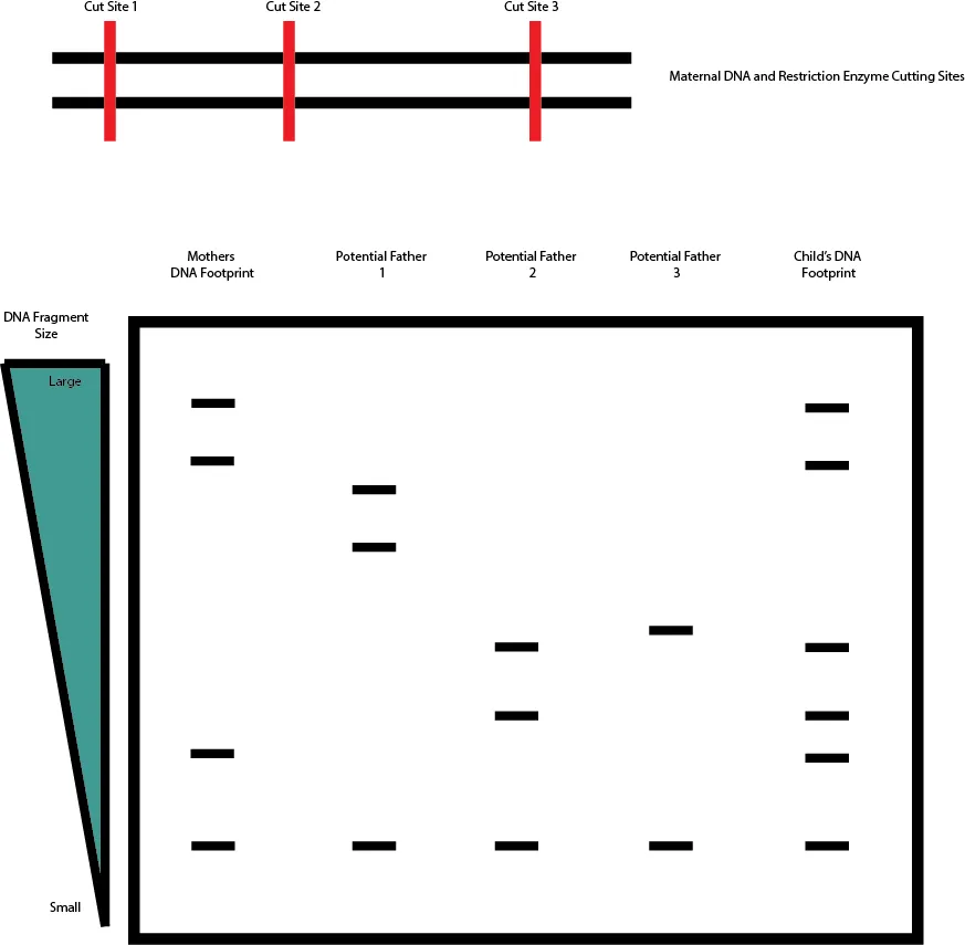 In the above example we have DNA footprinting results from a mother, her child, and three potential fathers. DNA is obtained from all of the people (usually through a cheek swab) and the DNA is cut by a restriction enzyme as I described earlier. The child is the genetic combination of its parents, thus the sum of the footprint of both of its parents (not exactly, but for this example lets simplify things a little). So we can see that the child’s footprinting pattern is the equivalent of the footprints from the mother and potential father #2. Congratulations potential fathers 1 and 3, you are NOT the father. Potential father #2 can now look forward to child support payments based on the results of our genetic test.