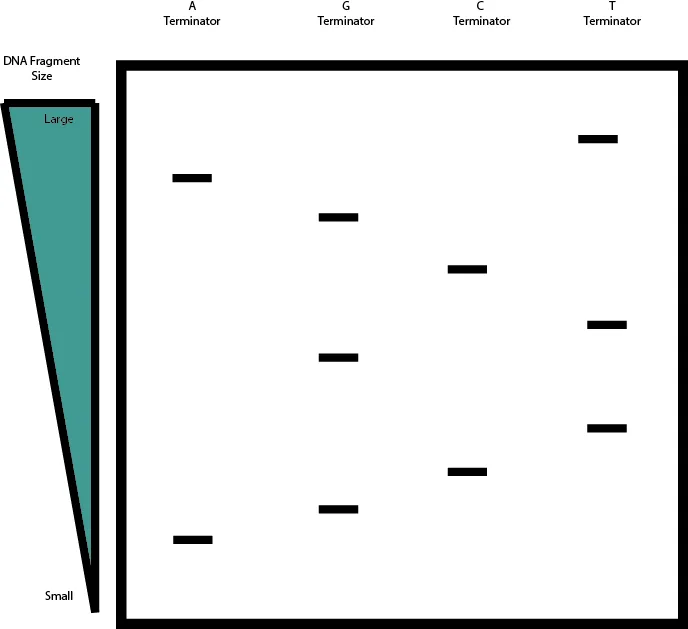 To understand this we must discuss DNA sequencing. For this I will discuss the oldest and easiest to understand method Sanger Sequencing. This is a PCR based technique where a gene is amplified, but in the reaction are include nucleotides that will terminate a growing chain. We set up 4 reactions, one with each nucleotide terminator ( a C terminator, a G terminator an A terminator and a T terminator ). Then the reactions are again run on a gel (Figure 4).