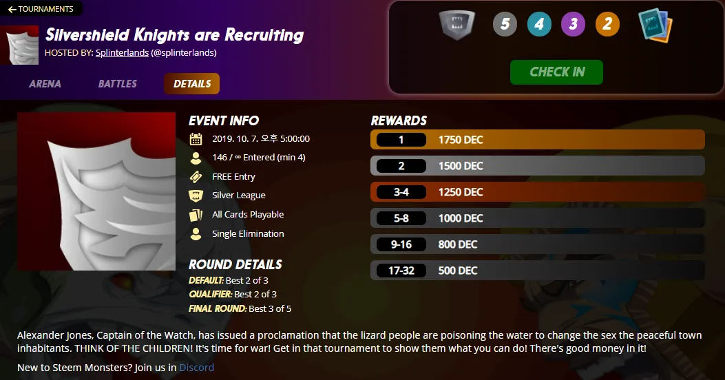 하지만 주로 DEC, STEEM을 상금으로 많이 대회가 개최됩니다.토너먼트를 생성하는 버튼입니다.