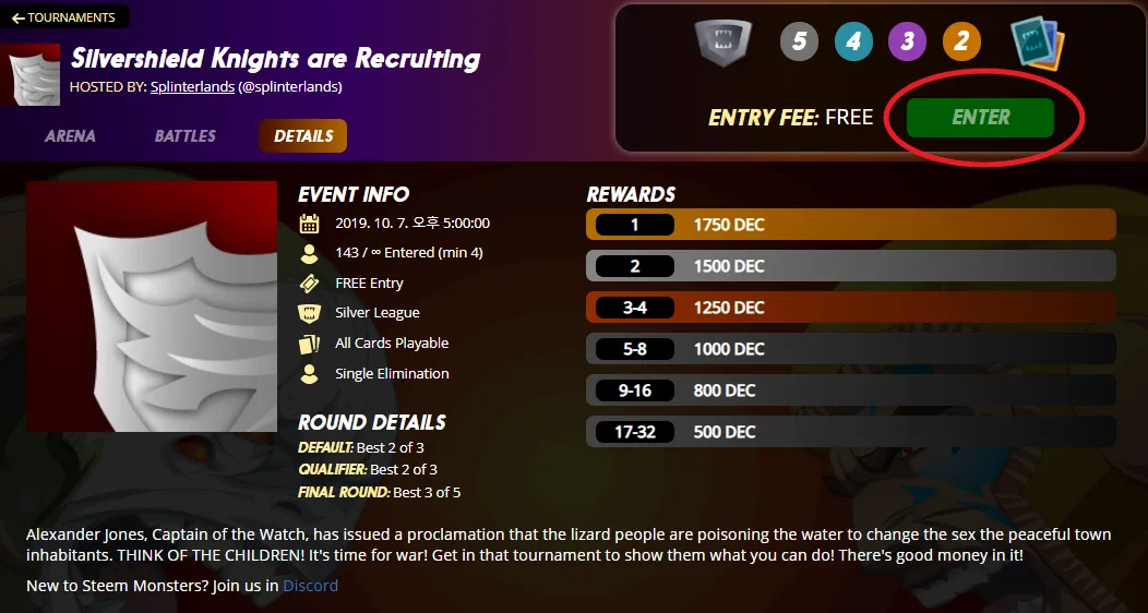 ENTER를 클릭하여 토너먼트에 참여를 합니다.