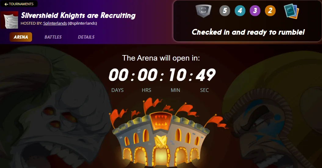 이때 ARENA 탭을 가보면 토너먼트가 몇분 남았는지 알수 있습니다.