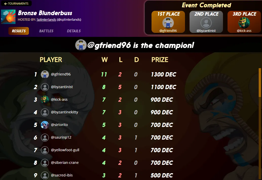 ARENA 탭에 아래와 같이 최종 게임 결과가 나옵니다.