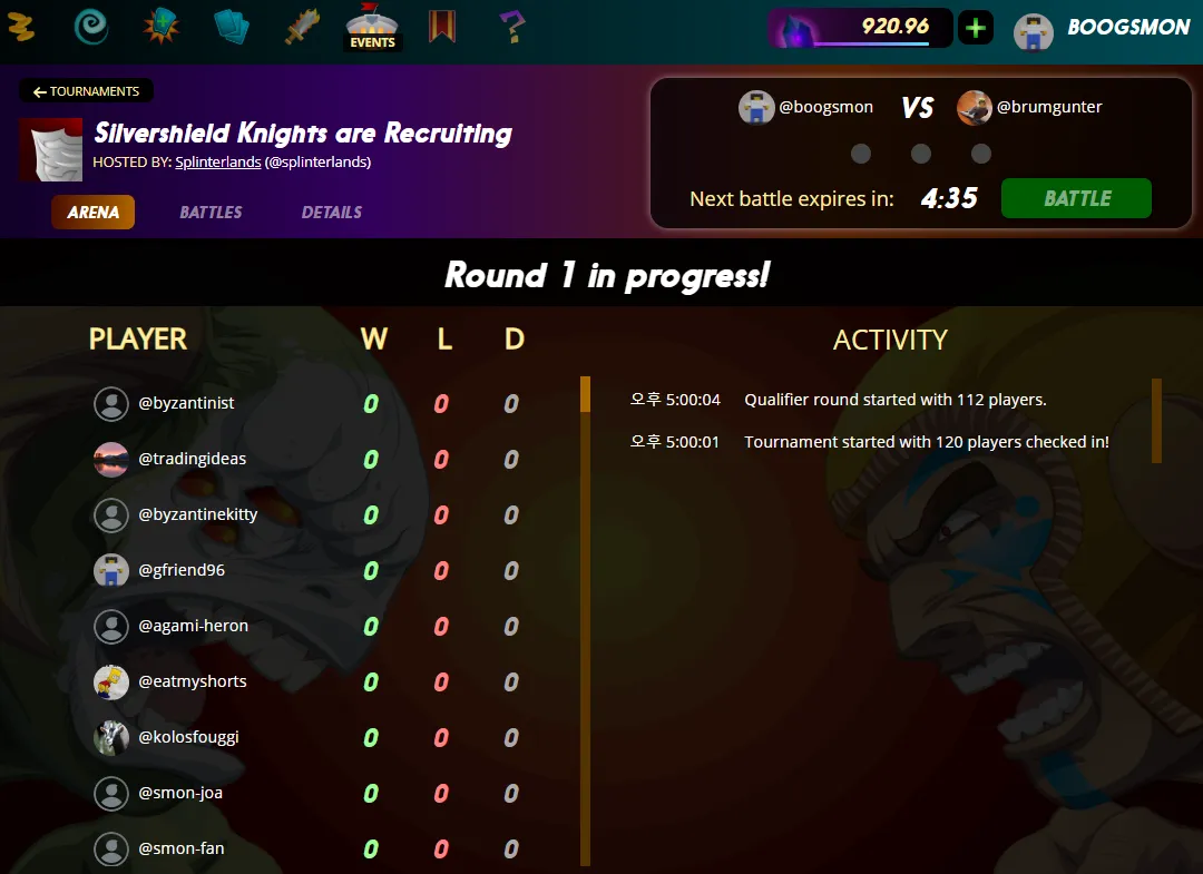 오른쪽 ACTIVITY 를 보시면 체크인 한 사람이 120명이고 112명에 예선전을 치른다고 나옵니다.