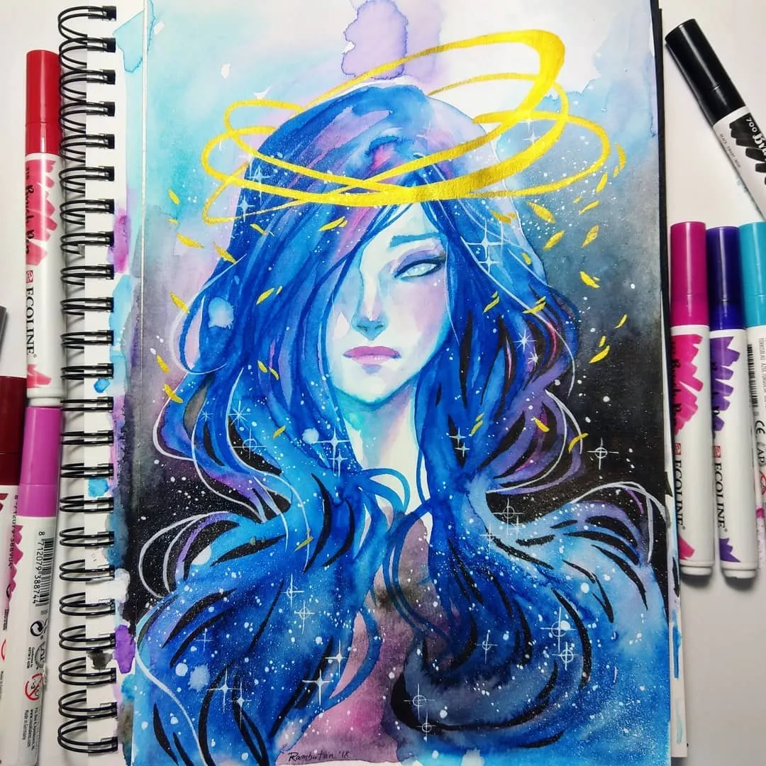 I wish you all a happy and healthy start in the new year! And may you achieve all your goals! ππ #share2steem #art #artzone #steemartists #ecolinewatercolor #ecoline #ecolinebrushpen #galaxygirl #spacegirl #starsπ #starsfreckles