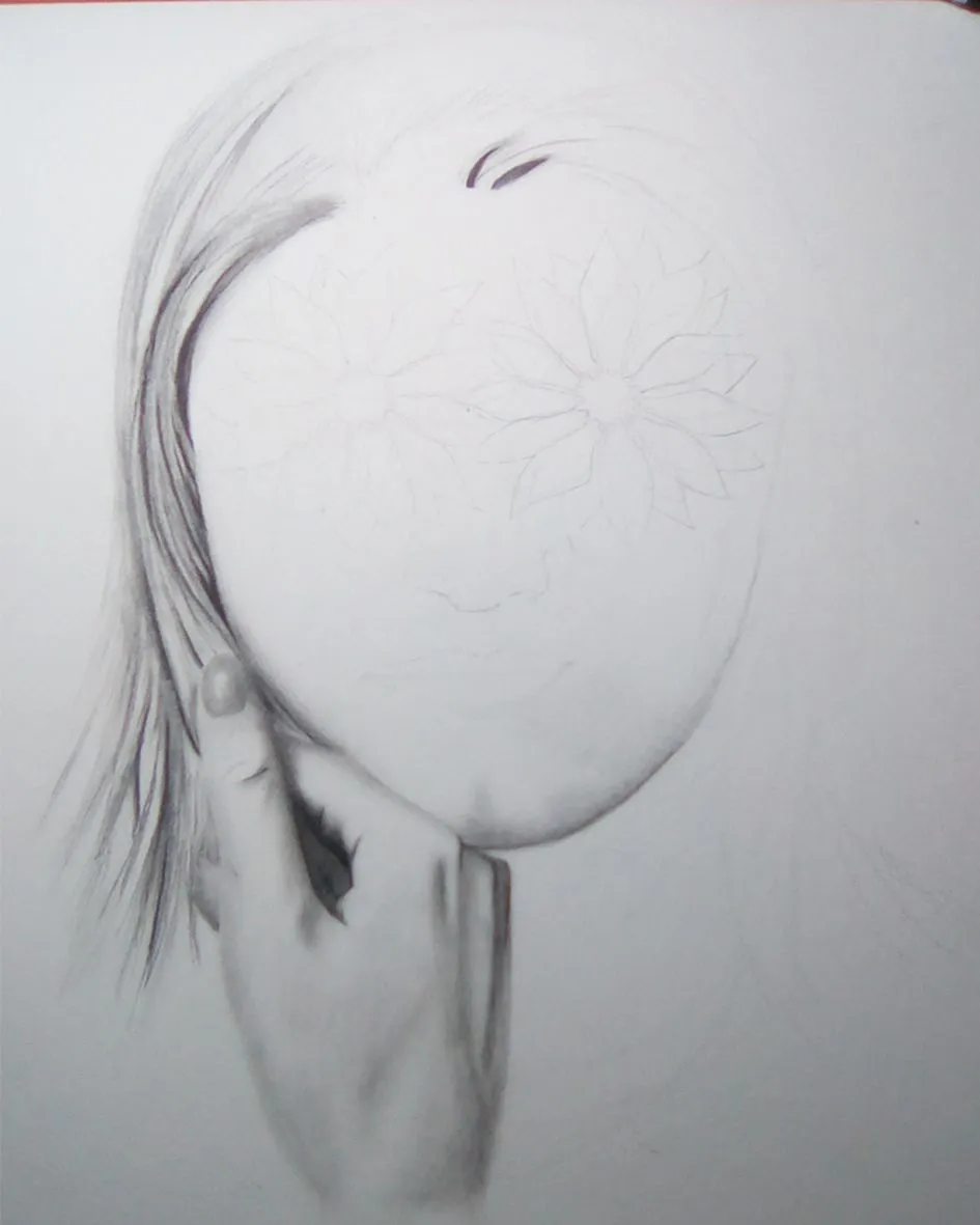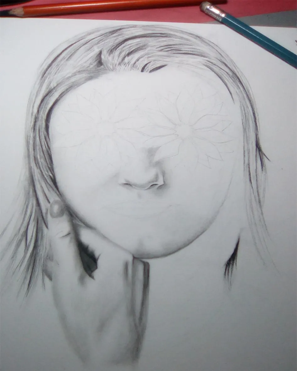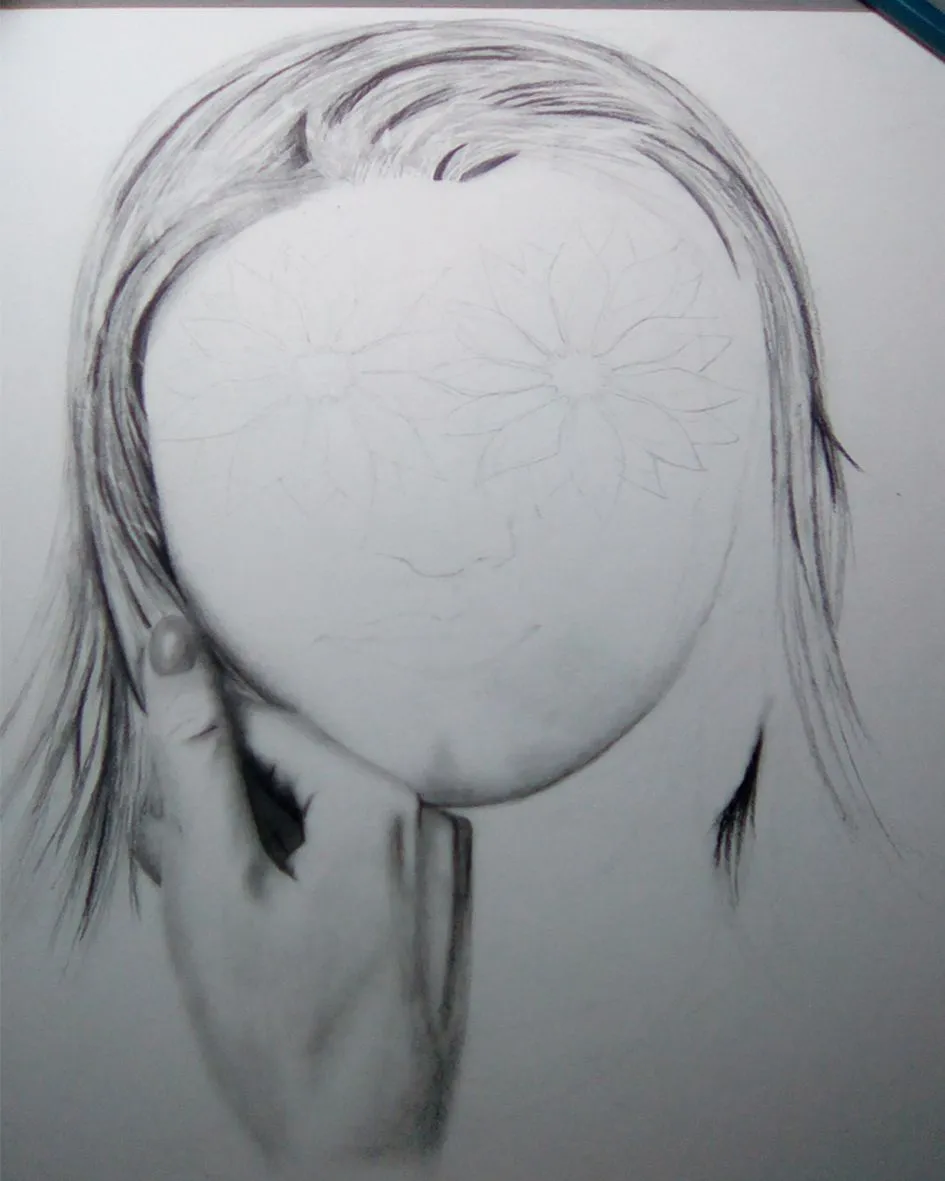 Illustrate in the same way the right side of the hair, but I could not continue because I needed to make the flowers before, since part of the hair covers her face but I did not want to cover the flowers, so let the hair up there to give volume to the face with some shadows using the HB pencil.