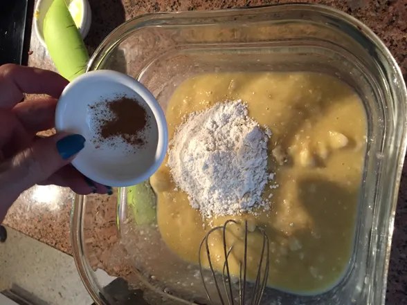 - Añadimos ahora la harina, que debe tener mezclado el bicarbonato de sodio/polvo de hornear, y la canela, mezclamos hasta que se integre.