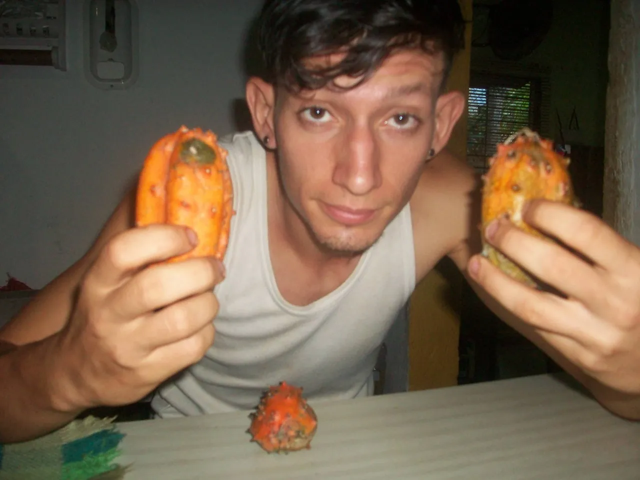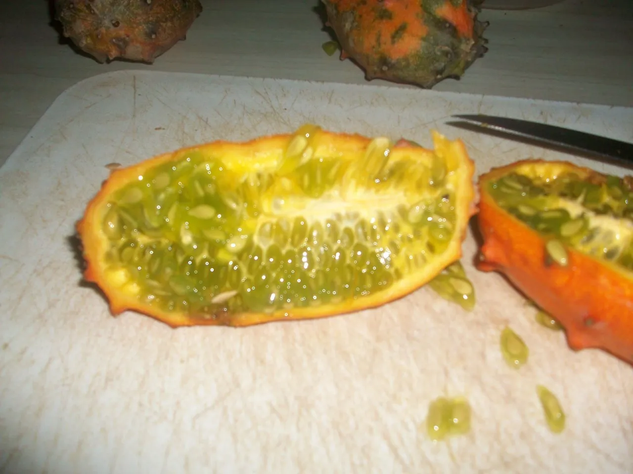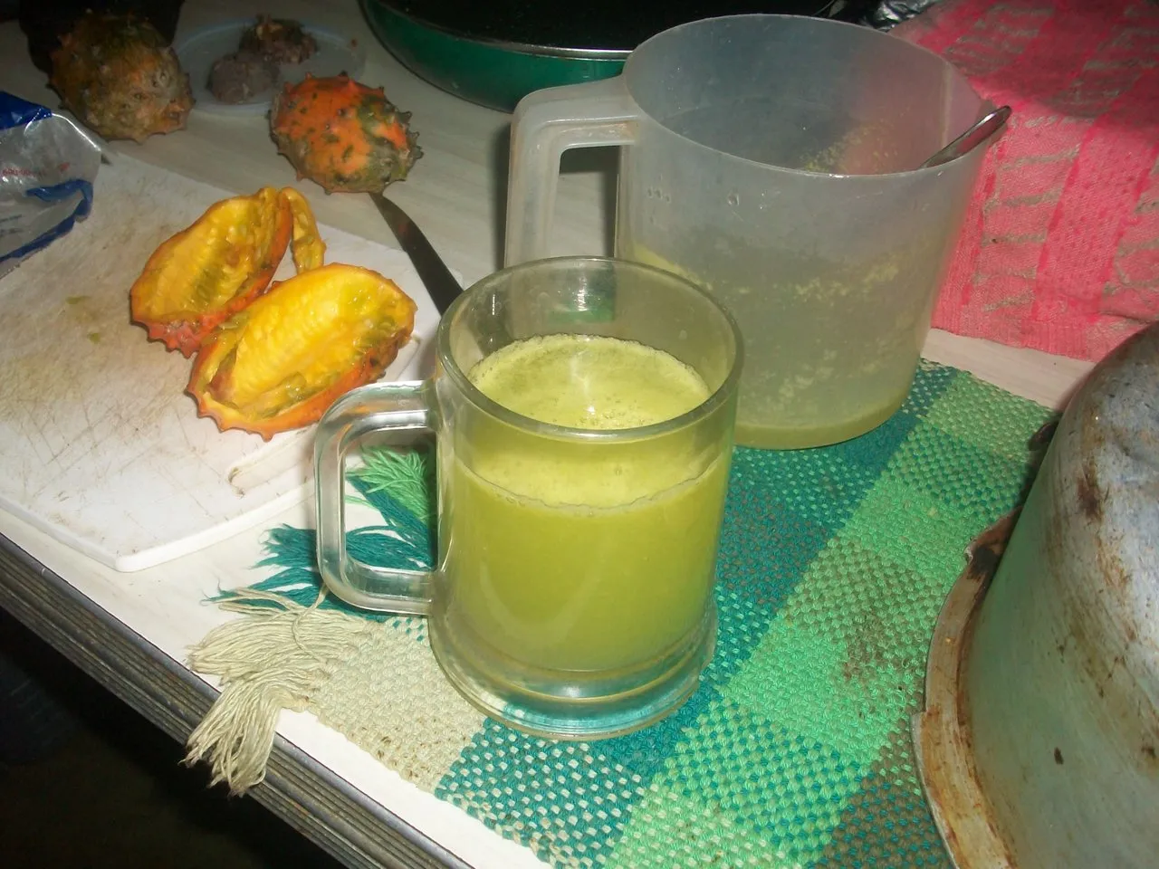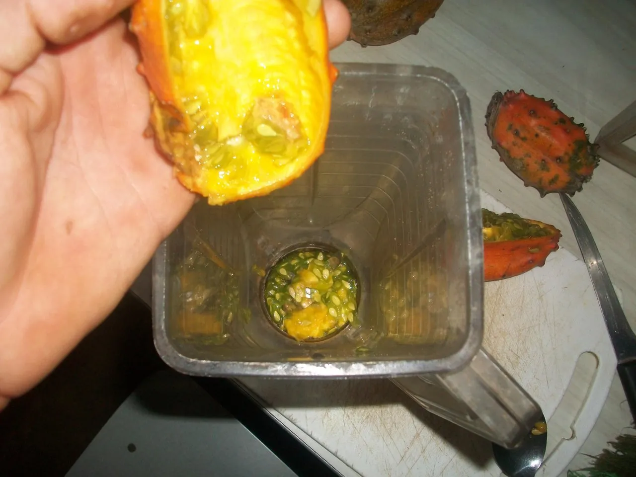 Cuando llegué a la granja, lo primero que hice fue examinar la fruta, así que la corté con un cuchillo y vi su interior, era verde y las semillas estaban cubiertas con la pulpa de la fruta. Su olor era neutro pero el sabor de la pulpa era como ácido, ciertamente hasta me daba miedo comer por no saber con que estaba tratando. Así que busque mas información en la red acerca de esta fruta y resulta ser que no era dañina, todo lo contrario es una fruta de la familia de los pepinos. Asi que entonces procedí a hacer un jugo, comencé a licuar y finalmente separé los residuos del jugo.