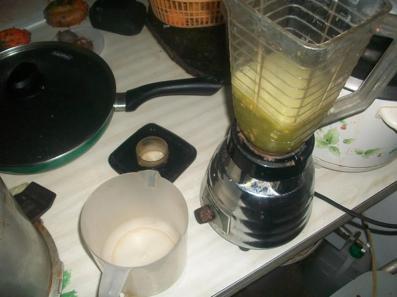 Colocando la pulpa verde de la fruta dentro de una licuadora