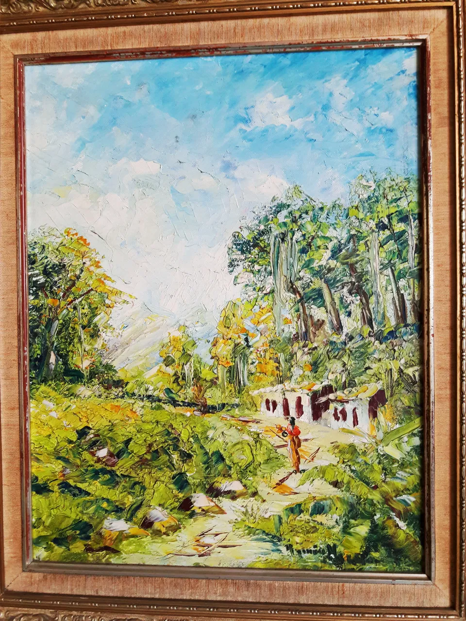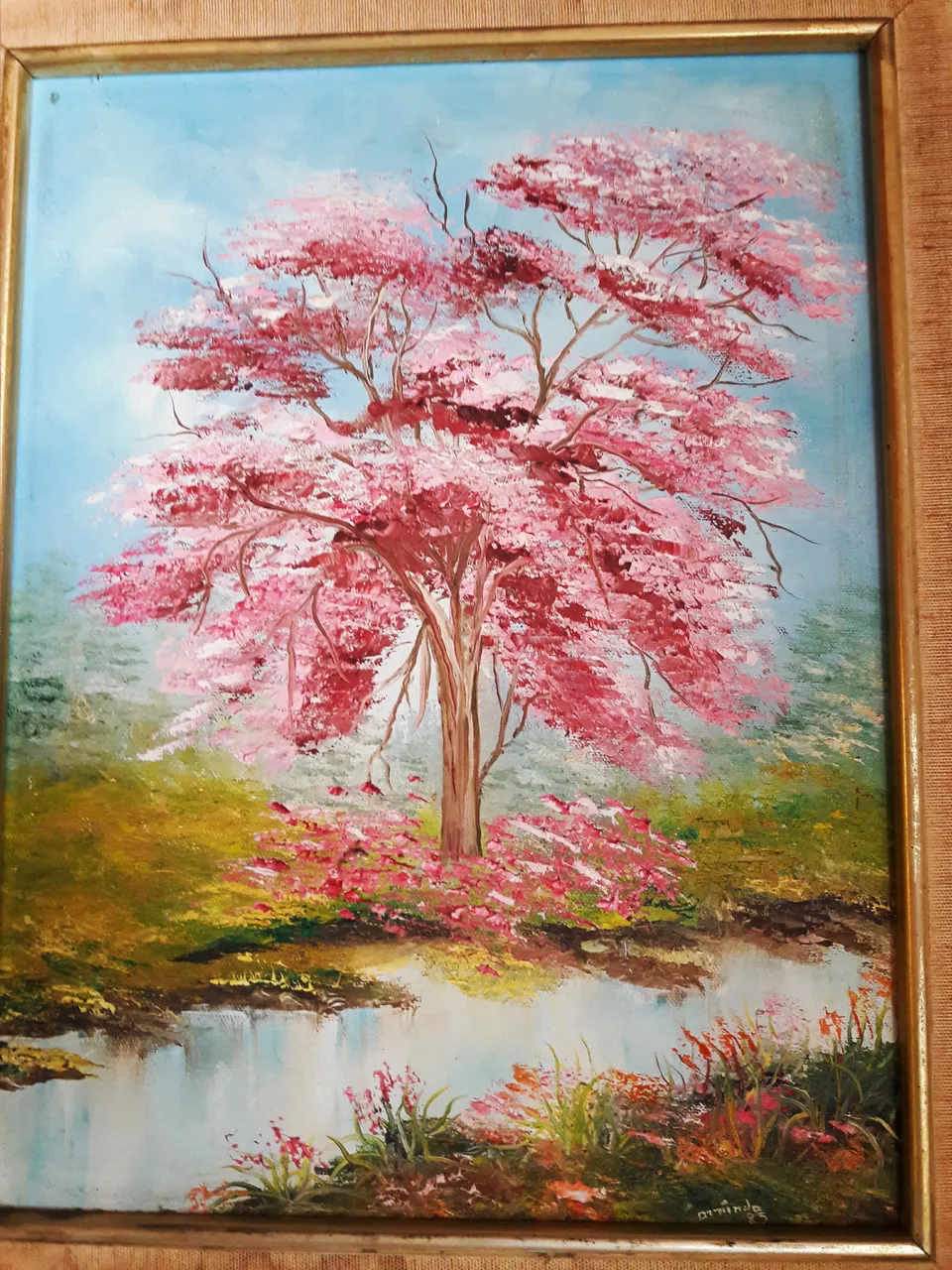 Antes de tomar fotos de este cuadro, me puse a observar los trazos y el degradado de los colores. En los tiempos de antes se utilizaba mucho esa técnica para crear un aspecto más artístico donde se notara la diferencia de otros cuadros. El árbol rosado fue hecho con paciencia y obtuvo un valor sentimental a la dueña, es decir, Muñe, en mi opinión me gusta el tono rosado de las hojas y como reflejó el agua para hacerlo más realista.