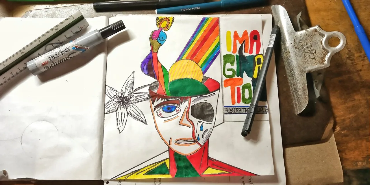 Así se titula la nueva producción musical de una de mis bandas favoritas de toda la vida, FOSTER THE PEOPLE. Y es que posterior al anuncio de esta nueva canción el día 19 de junio del presente año decidieron invitar a sus fanáticos a usar su imaginación para crear un diseño que fuera usado como parte del arte gráfica del nuevo sencillo en la plataforma de spotify, además que formara parte de la mercancía de edición limitada de los FOSTERs, motivo por el cual no podía perderme este concurso. Para tal tarea la banda publico la letra, la música y un arte gráfico "previo" para el lanzamiento de la canción IMAGINATION (imagen que llevaba el estilo de la banda desde el año 2009), por lo tanto la inspiración era mas que suficiente para hacer volar mi creatividad... me tomo algunos días consolidar la idea principal, hasta que después de una semana pude concluir con mi imaginación.
