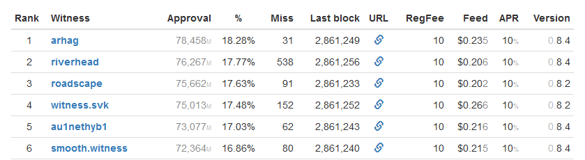 Como puede ver, la lista se clasifica por votos de aprobación y el porcentaje de la red SP que vota por ellos. Muestra cuántos bloques han perdido desde el principio, el último número de bloque que han producido, un enlazarenlace a su URL de testigos, la "cuota" (no es realmente una cuota ya que va a una cuenta como SP) para una nueva cuenta creación, el precio de alimentación, el Steem Dollar APR%, y la versión del software de nodo steemd que ejecutan. Cada nombre de cuenta de testigo en la lista es un enlace a su página de steemd.com.