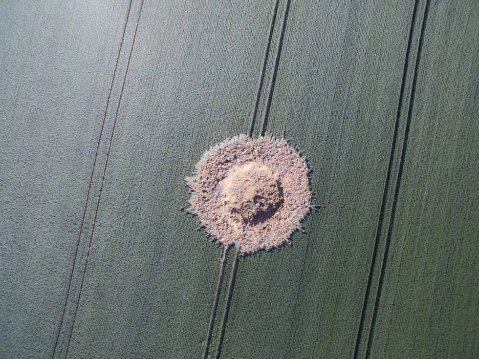 Una bomba de la IIGM ha explotado en un campo de maíz en Alemania,dejando ese rastro de pezón de maíz extrusionado, rosetas vaya. Ochenta años después, hay algo de belleza poética en algo destinado a la destrucción.