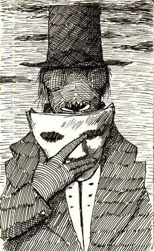 Aquel ser siempre la observaba intensamente, con los blancos y resplandecientes como dos orificios vacíos, y rodeados por un entorno a veces indefinido por la pobre mujer. Muchas veces soñaba que aquella aparición, ente o criatura se posaba en la ventana de una habitación que no era la suya, y atravesaba las paredes moviéndose lentamente hacia ella, alzando acechador sus garras de animal carroñero.
