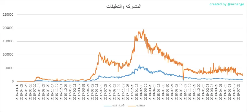 تظهر هذه الرسوم البيانية تطور المشاركات والتعليقات طوال عمر blockchain الكامل ولمدة 30 يومًا.