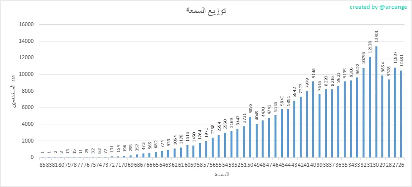 يوضح هذا الرسم البياني توزيع السمعة بين المستخدمين. تمت إزالة حسابات ذات سمعة أقل من 25 للحفاظ على الرسم البياني مقروء.