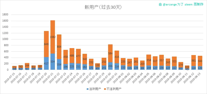 这些数据表显示了最近30天内用户随着时间的活动情况。这里的活跃和上面的定义是一致的。最后面的这张数据图显示了每月的活跃用户数。这可以让我们和 Steem 上的数据甚至是其它社交网络上的数据做比较。