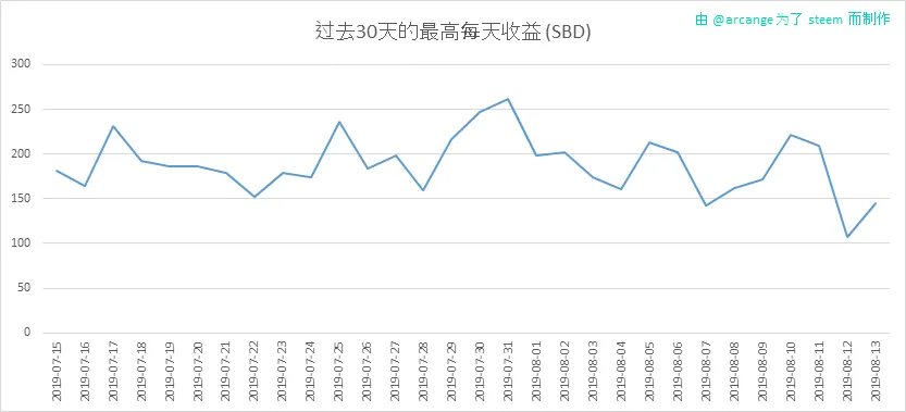这个图表显示了每一天(整个区块链和过去30天)内在一篇帖子(或者评论)上的最大奖励(收益)