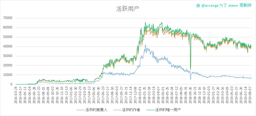 这份图表显示了在 Steem 新注册的用户并且有多少用户是活跃的。我们可以看到有很多的帐号被创建了,但是从来没有被使用过。