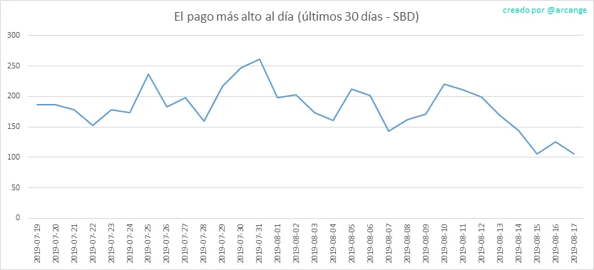 Estos gráficos muestran la recompensa máxima pagada en un post (o comentario) por cada día (duración de bloque completo y los últimos 30 días).